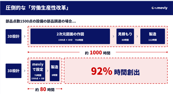 meviyは機械部品の3DデータをアップロードするだけでAIが自動で即時見積もり、独自のデジタル製造システムにより最短1日での出荷を実現します。これまで、機械部品調達時に発生していた作業時間の9割以上を削減することで、お客さまの部品調達における非効率を解消するプラットフォームです。4年連続で国内シェアNo.1を獲得、第9回ものづくり日本大賞において「内閣総理大臣賞」を受賞し、製造業の生産性向上において高い評価を得ています。海外でのサービス提供も拡大しており、部品調達DXを通じた時間価値をグローバルで提供しています。