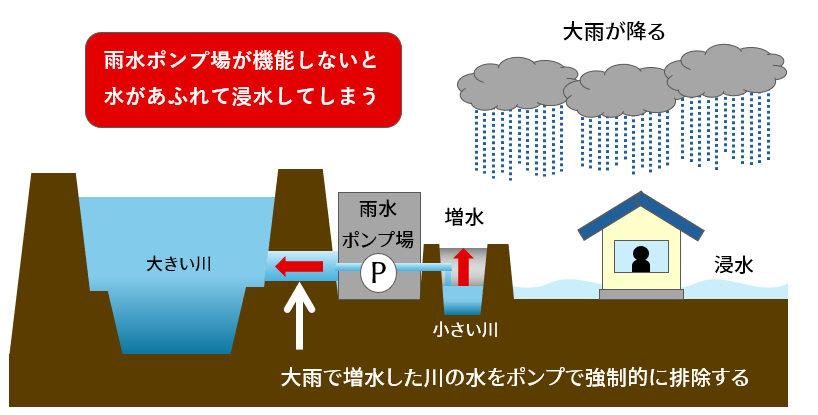 近年増加する大雨に対する従来ポンプの課題を解決し、浸水被害から人々の暮らしや生命を守っている。