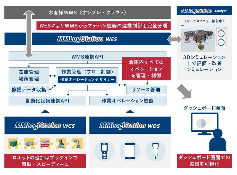 倉庫自動化システム「MMLogiStation」とは、自動化設備の導入をスピーディにするだけではなく、人や機器といった倉庫内のオペレーション全体の最適化を実現するWES(倉庫実行システム)です。