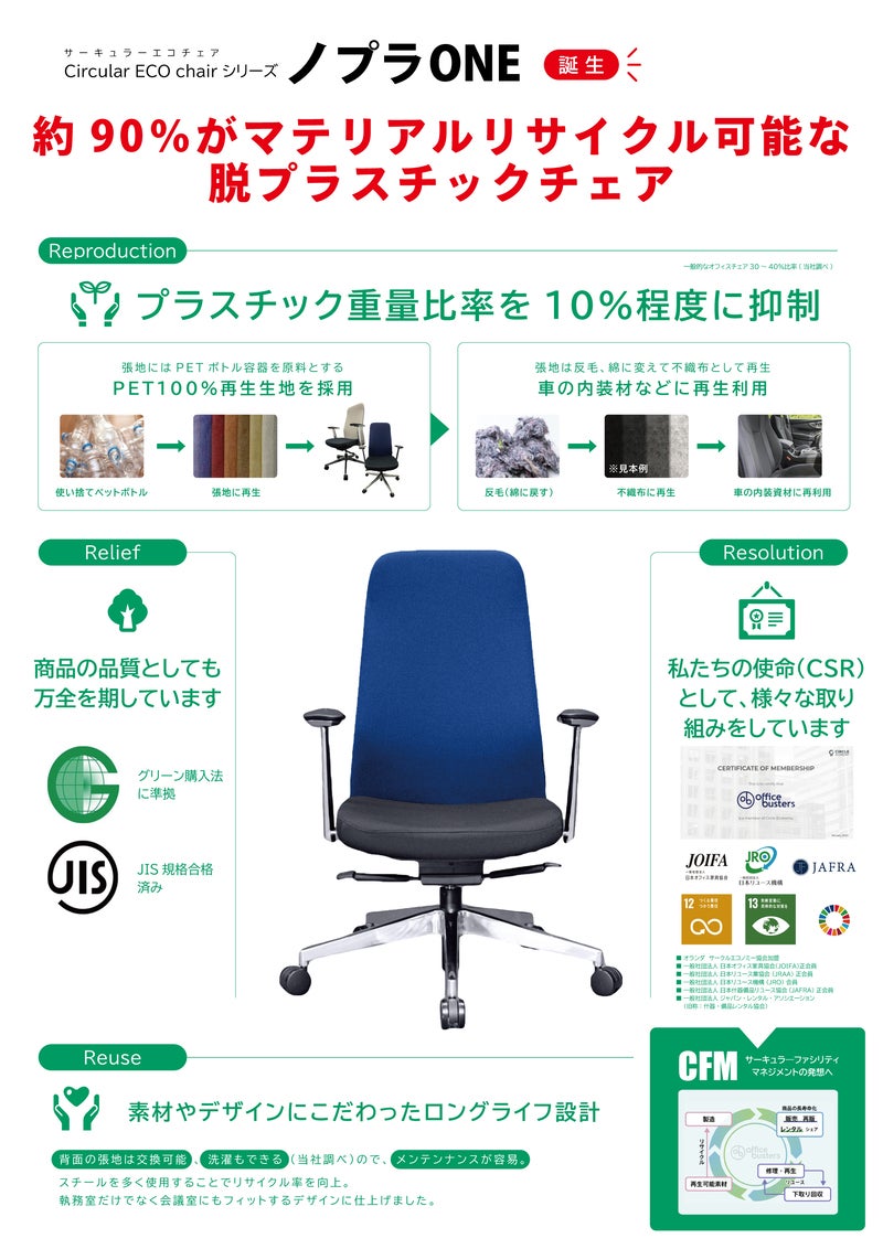 プラスチックを10%程度と最小限にしたハイバックオフィスチェア、世界最少レベル※の脱プラスチック「オフィスチェア」を発売。レンタルバスターズが挑む「循環型ワークプレイス」とは