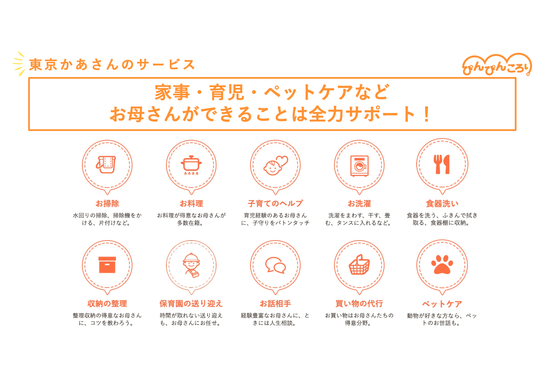 “東京にもう1人のお母さんを”をコンセプトとした、おせっかいスタイルなご家庭サポートサービス。家事代行やベビーシッターの枠を超えて、料理や掃除のコツを教えたり、育児の悩み相談に乗ったり。熟練主婦のお母さんがまるで親子のような関係で、子育て家庭を幅広くサポートします。現在1都3県(東京都、神奈川県、埼玉県、千葉県)でサービスを展開中。