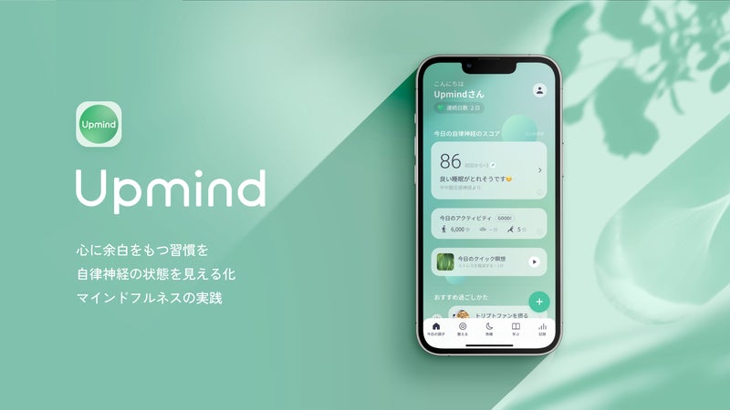 「Upmind」は心に余白をもつ習慣を実践できるマインドフルネスアプリです。東京大学との共同研究で、科学的な検証を元に開発に取り組んできました。スマートフォンのカメラに30秒指を当てるだけで自律神経のバランスを解析し、改善に適した習慣をレコメンド。専門家監修のもと、瞑想やヨガをとおして手軽にマインドフルネスが実践でき、客観的かつ効果的に心をととのえることが可能です。