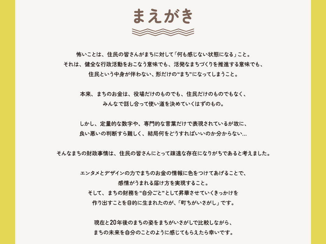 この冊子の表・裏表紙は現在の町と20年後の町の「間違い探し」になっており、冊子を読み進めることで、答え合わせの過程で町の取り組みや財政状況を知ることができます。