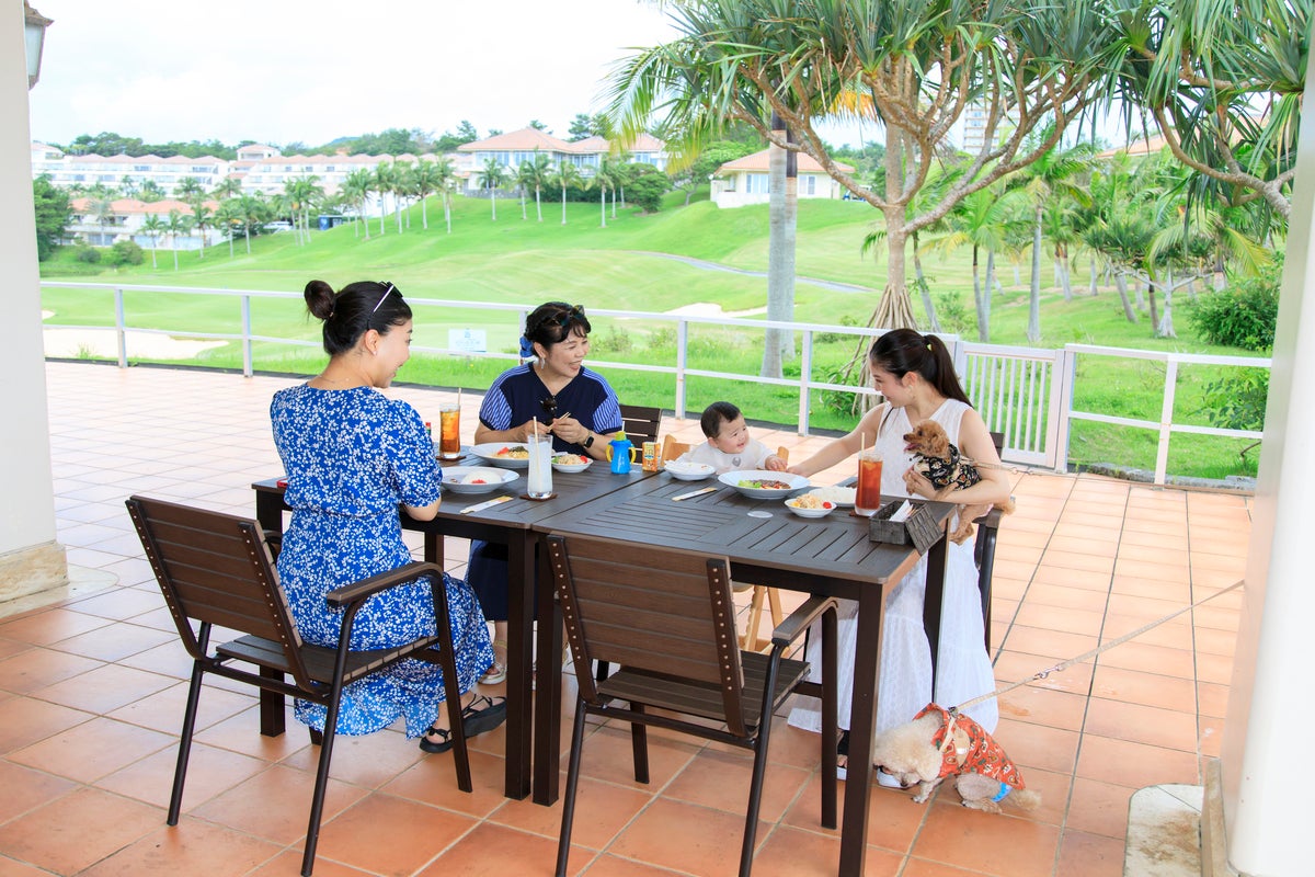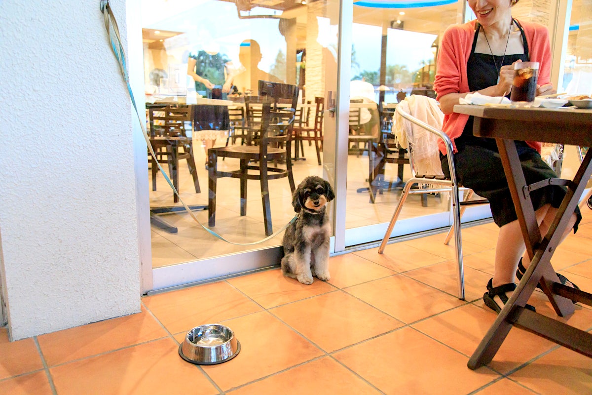 ブッフェスタイルで朝食やディナーを楽しめる「カジュアルダイニング パラディ」と、朝食とランチタイムにハンバーガーなどの軽食やスイーツを味わえる「オープンテラスカフェ ファミーゴ」の2つのレストランに、愛犬と一緒にお食事をお楽しみいただける専用のテラス席をご用意しております。お席の近くにはリードフックを完備しているので、周りのお客様にも気兼ねなくご利用いただけます。