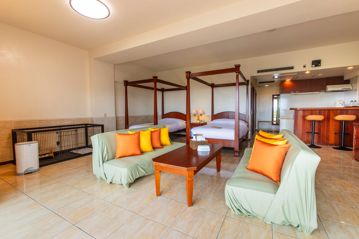 愛犬と一緒にお泊まりいただける4室限定の客室。カヌチャリゾートの中心部から離れた自然豊かなエリアに位置する宿泊棟「マグノリア」に設定。1部屋に中型犬までのワンちゃん2匹までご宿泊可能です。
