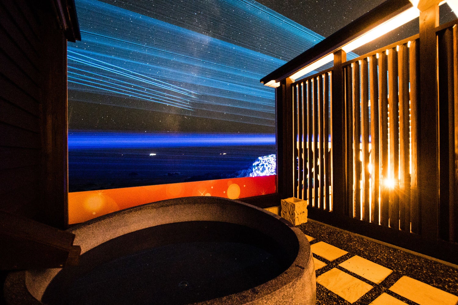 両宿とも国内では例を見ない電動開閉式露天風呂を全室に備えた客室で滞在を楽しむプライベート重視の宿であり、さらなる客室で楽しめる究極のサービスとしてレーザーメッセージサービスをスタートさせ、3年間で7000通を超えるメッセージを投影し宿泊者に感動の旅となられるお手伝いをさせて頂いております。