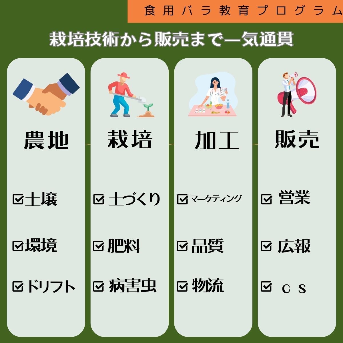 定年後のセカンドステージ構築や脱サラ後の仕事として食用バラ農家を目指すプログラム。
