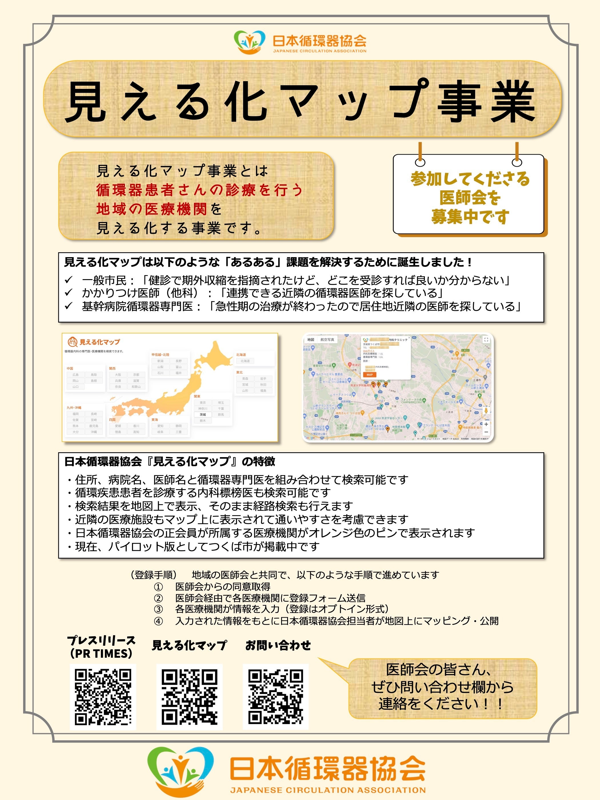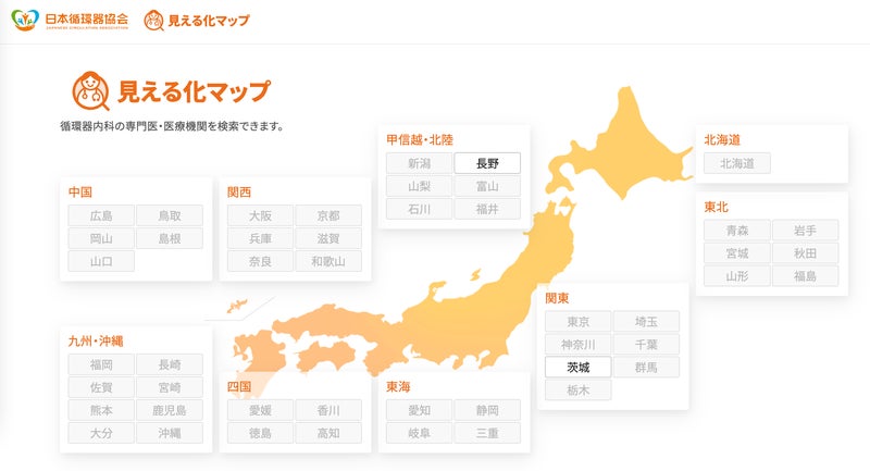 日本循環器協会「見える化マップ」は、あなたの近くで高血圧や糖尿病などの生活習慣病を診療する「内科系標榜医」や、不整脈や心不全といった心臓病を診療する「循環器専門医」を地図上にマッピングし、自分に合ったお医者さんを簡単に見つけることに役立ちます。これにより、循環器病治療へのアクセスが向上するとともに、医療機関同士の連携も促進します。現在、茨城県つくば市に続き長野県松本市で展開中。