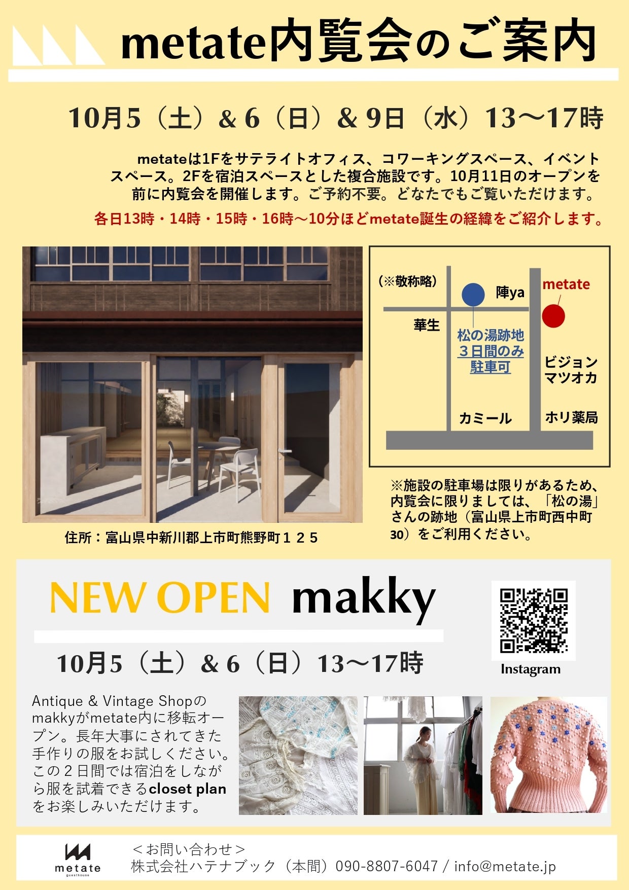 1984年、東京生まれ。子ども向け新聞社の事業部、広告代理店を経て、事業承継をきっかけに2019年に株式会社ハテナブックを設立。2020年からはNPO法人離島経済新聞社の島の未来づくり推進室にも所属。東京都新島村の「地域活性化企業人」では、東京と新島の2拠点生活を送り、富山に移住後も富山と新島の2拠点生活。現在は、富山県上市町の「地域活性化企業人」として、移住者の受け入れや地域おこし協力隊の採用業務などに従事。またアンティーク・ヴィンテージの専門ECサイト「makky」を運営。国内だけではなく海外へ販路を広げている。2024年10月11日に、富山県上市町にゲストハウスとマルチスペースを兼ねたmetateをオープンする。