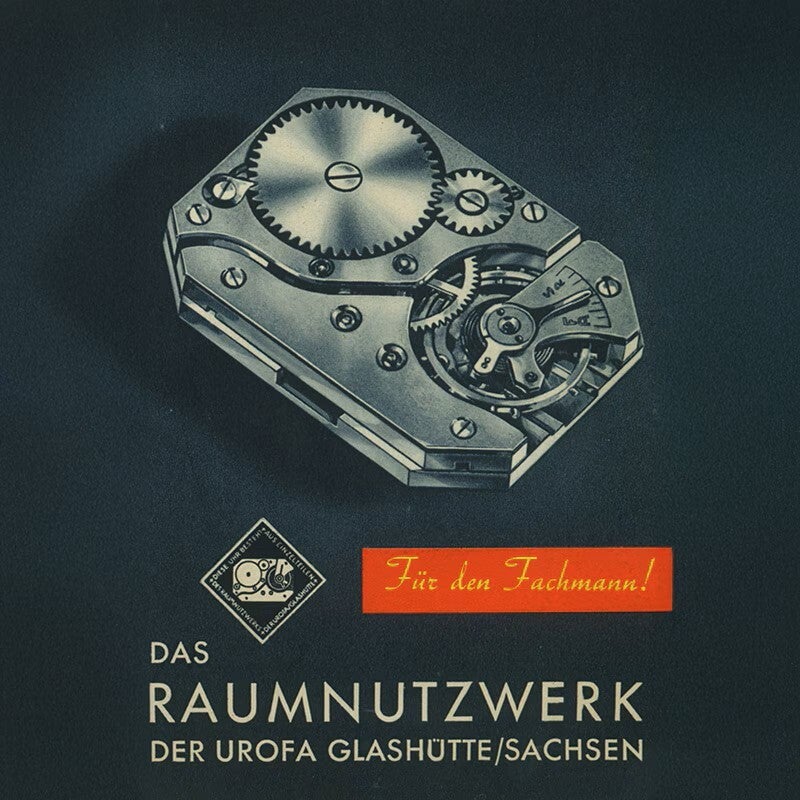 ムーブメントを開発する際、大型のシングルバレルを優先し、同様に大型のテンプと対比させました。懐中時計の構造で実証された原理を小型化したもので、機械部品を可能な限り小さなスペースに収めるため、技術者たちはスイープ運針を力の流れの中に直接配置しないことにしました。その代わりに秒針をゼンマイバレルの上に垂直に配置できる関節的な駆動を設計。20 x 28mm、厚さ4mmというコンパクトなムーブメントの巧みなデザインをアピールし、その性能は懐中時計のそれと同等であることが強調されました。UFAGはこれらのムーブメントのいくつかを完成品に仕上げ、文字盤にはグラスヒュッテのGを記しました。