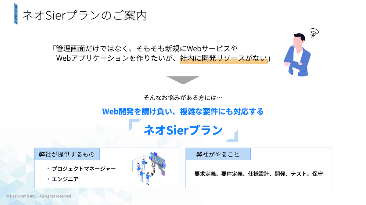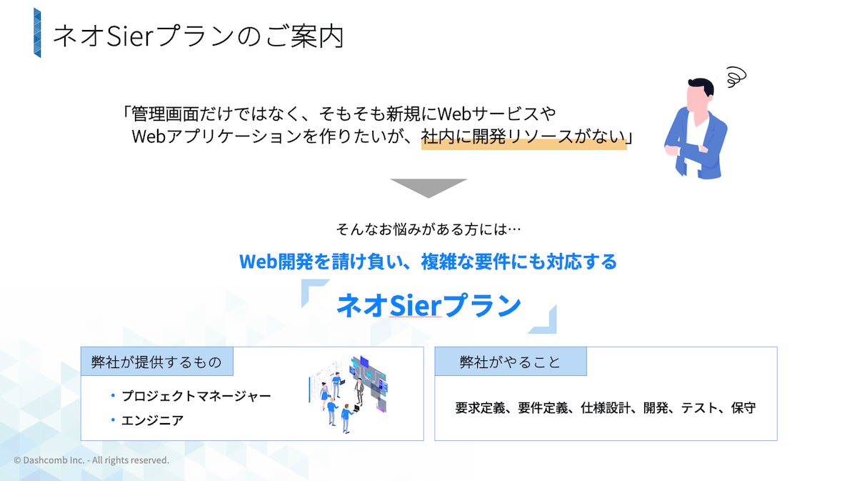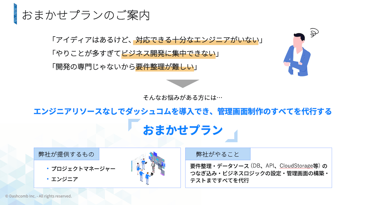 株式会社Dashcombはビジネスの成功を第一に考え、MVP開発(Minimum Viable Product、最小限の実用製品)を得意としています。システムを作り込む前に「そのサービスが解決すること」を企業様と一緒に考え、形にします。
