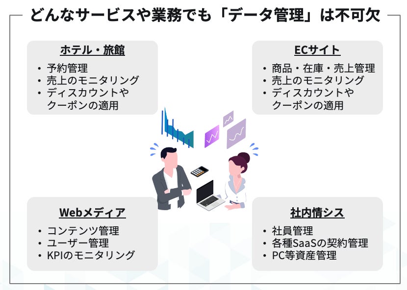 さらに、「ダッシュコム」は既存の基幹システム、クラウド上のデータベース、外部システムとのデータ連携も可能です。データベースの閲覧や情報更新もスムーズに行なえます。