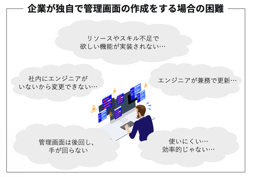 一般的に、エンジニアによって作られた画面は使いにくいことがありますが、「ダッシュコム」では、「使いやすいシステムの部品」をあらかじめシステム上に用意しておくことで、利用者が使いやすいシステムを短い開発期間で実現できます。