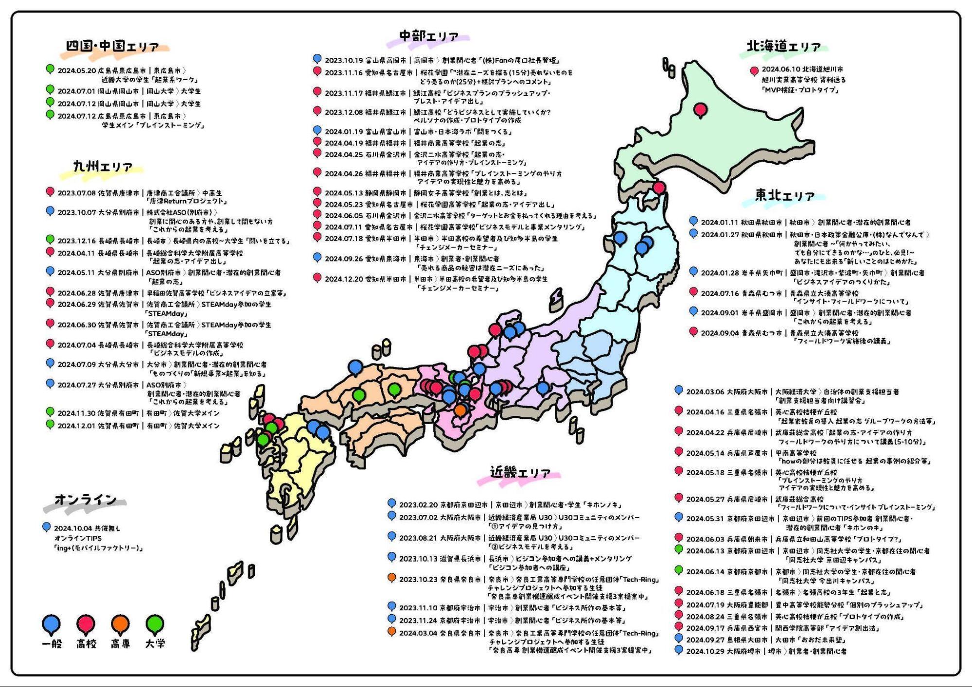 大企業から中小企業までの企業研修や、中小機構さん・地域のアクセラレーションプログラム・スタートアップコミュニティなど全国各地で開催しています。