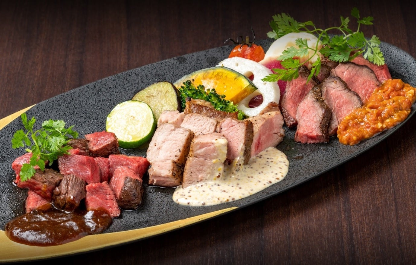 和牛イチボ、和牛芯玉カブリ、松坂豚肩ロースの3種を盛り合わせた当店一番人気メニュー。 強火のフライパンで両面をカリッと焼いた後ブランデーでフランベし、一度休ませた後オーブンでじっくりと火入れをします。9種類の中からお好みの3種をお選びくださいませ。