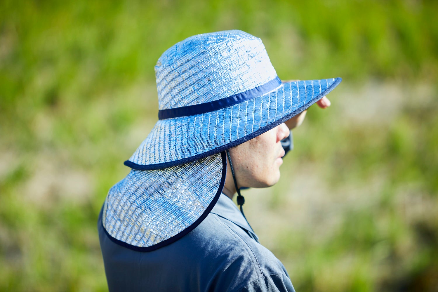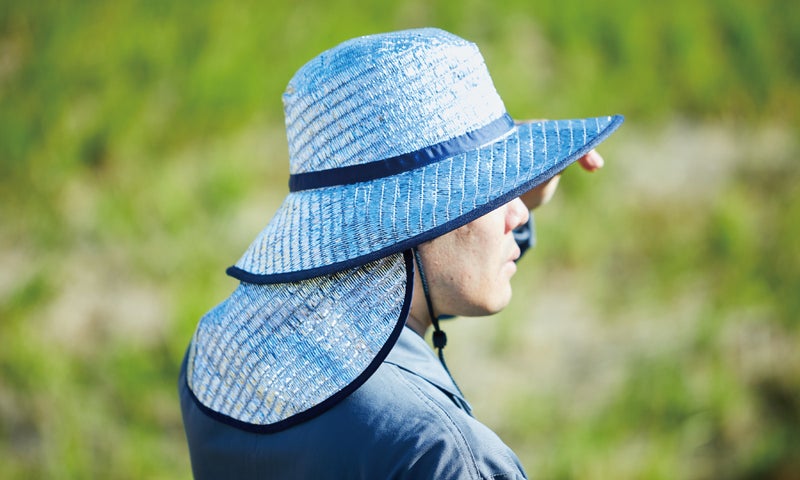農作業中の厳しい日差しから守るために開発され、丸福繊維独自技術「アルミクールテック」により、帽子内温度10℃涼しい遮熱帽子。