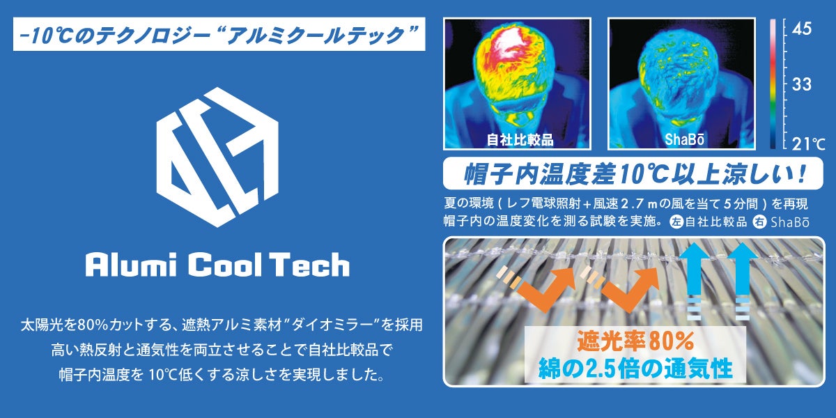 丸福繊維独自技術「アルミクールテック」を搭載し、帽子内温度10℃涼しい遮熱帽子。