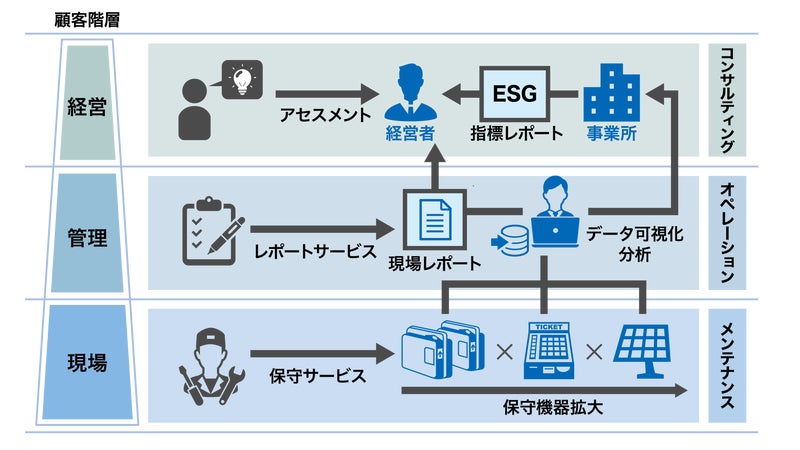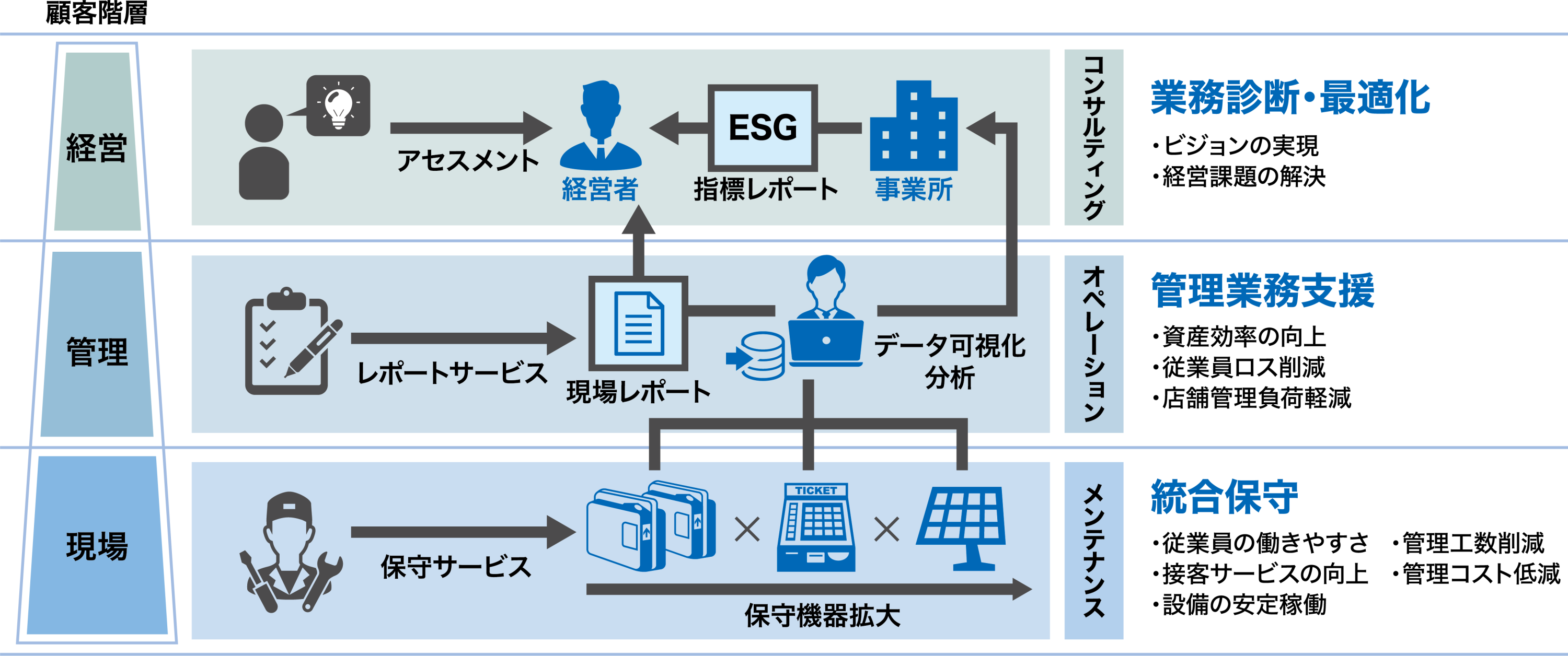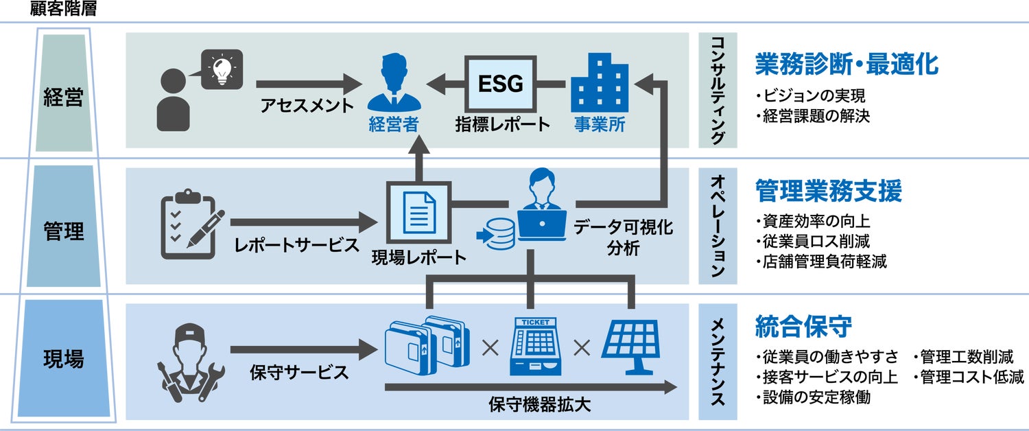 保守サービスを基点に、お客様の現場業務を最適化することで管理課題・経営課題の解決へとつなぎ、企業全体の課題にワンストップで応えるサービスです。