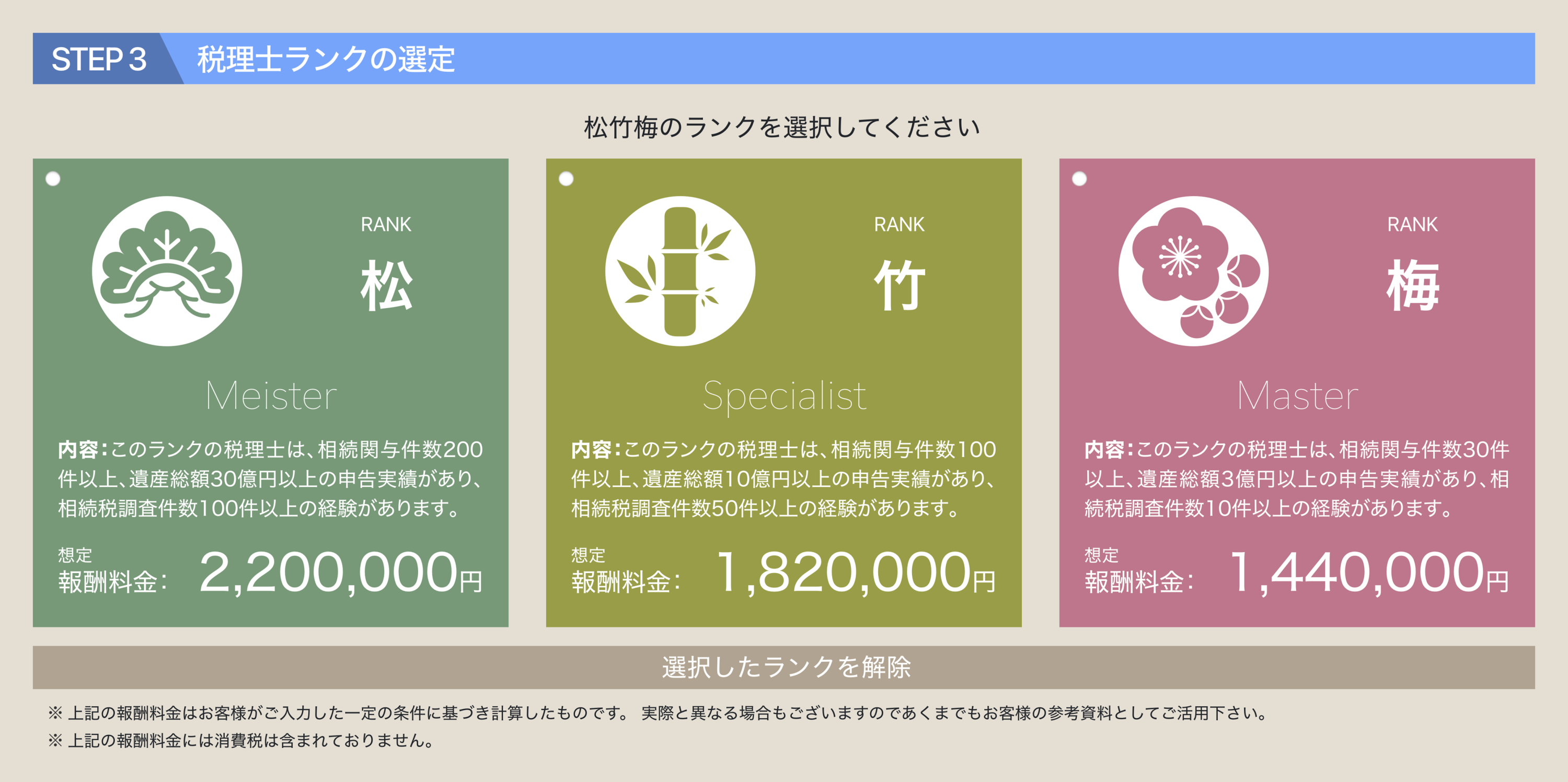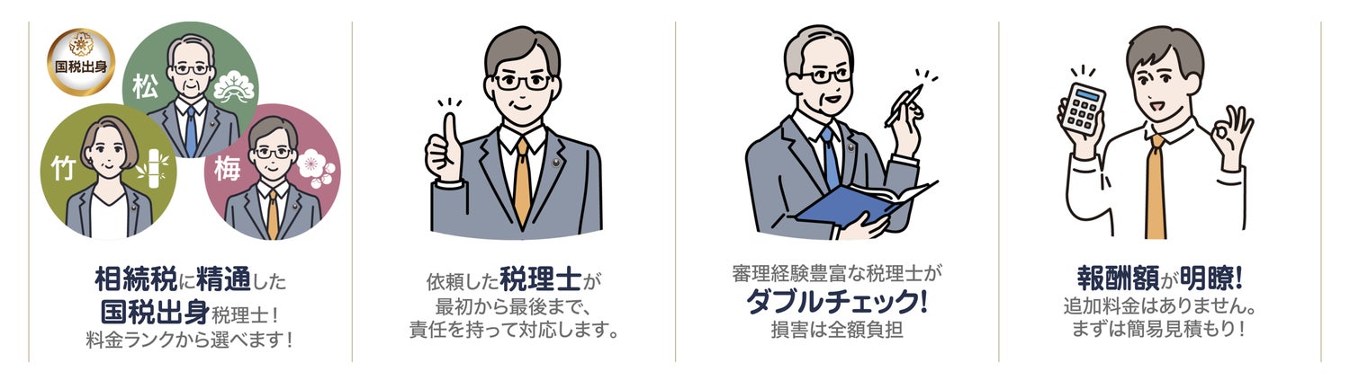 当サイトでは遺産総額と税理士の経験や実績、専門性などに応じたランク(松・竹・梅)で表示される報酬額は明瞭であり、相続案件の内容等による追加料金は一切ありません。ただし、依頼した書類の提出が著しく遅延した場合や依頼者とご連絡が取れない等の事情により申告業務が遅延した場合は、その期間に応じたペナルティ加算があります。