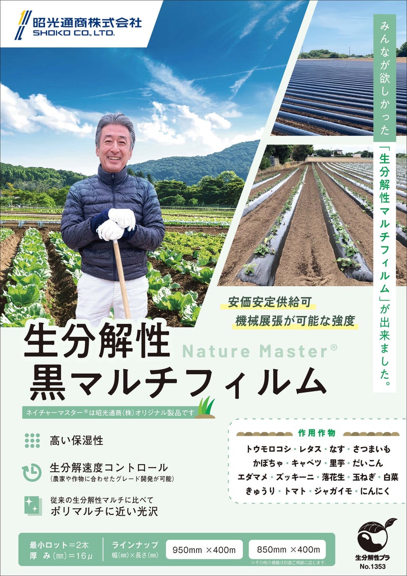 ⼟壌中の微⽣物によって⼀定期間で分解され、⾃然に⼟に還る環境にやさしい生分解性樹脂でできた黒マルチフィルムです。