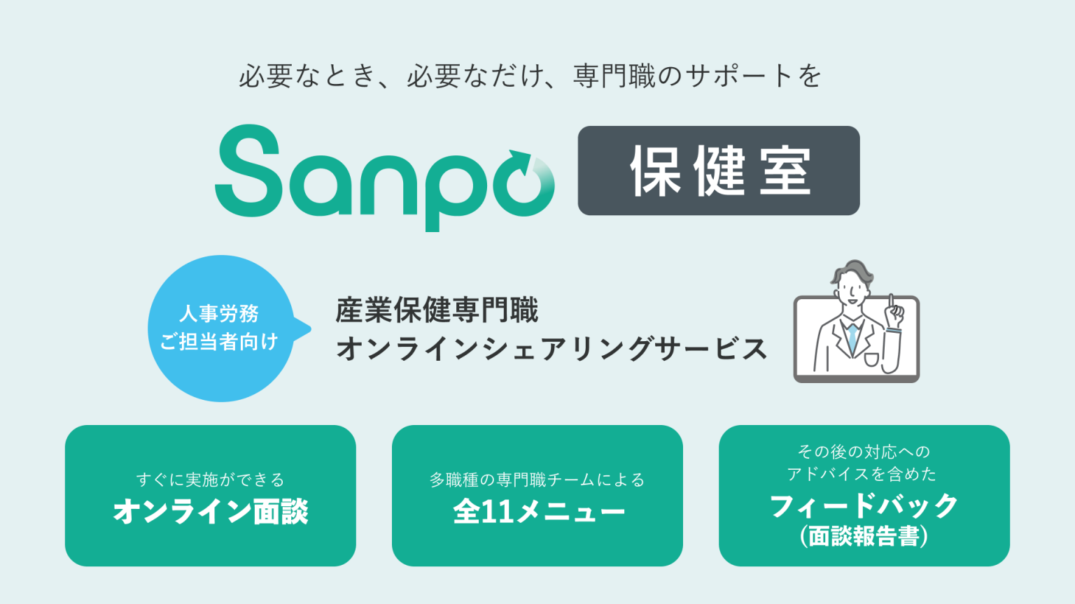 雇⽤コストをかけずに、必要なとき、必要なだけサポートが受けられる産業保健専⾨職のオンラインシェアリングサービス。