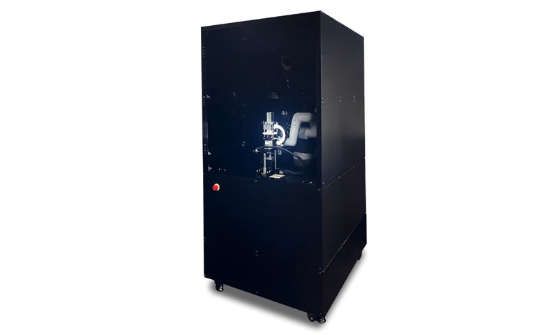 協働ロボット、照明付きカメラ、高性能AI検査ソフトウェアを組み合わせたAI外観検査システムです。従来検査が難しかったダイカストやプレス加工品といった複雑形状の立体物を全方位から撮影して360度検査を行い、0.1ミリの不具合まで検出します。