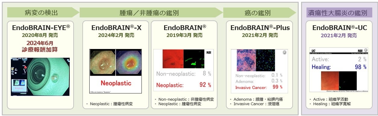 AIを活用して大腸内視鏡の診断を支援するソフトウェア「EndoBRAIN-EYE®(エンドブレインアイ)」を始め、腫瘍/非腫瘍の鑑別を行う「EndoBRAIN-X」、腺腫・粘膜内癌と浸潤癌を見分ける「EndoBRAIN-Plus」、潰瘍性大腸炎の疾患活動性を評価する「EndoBRAIN-UC」など。