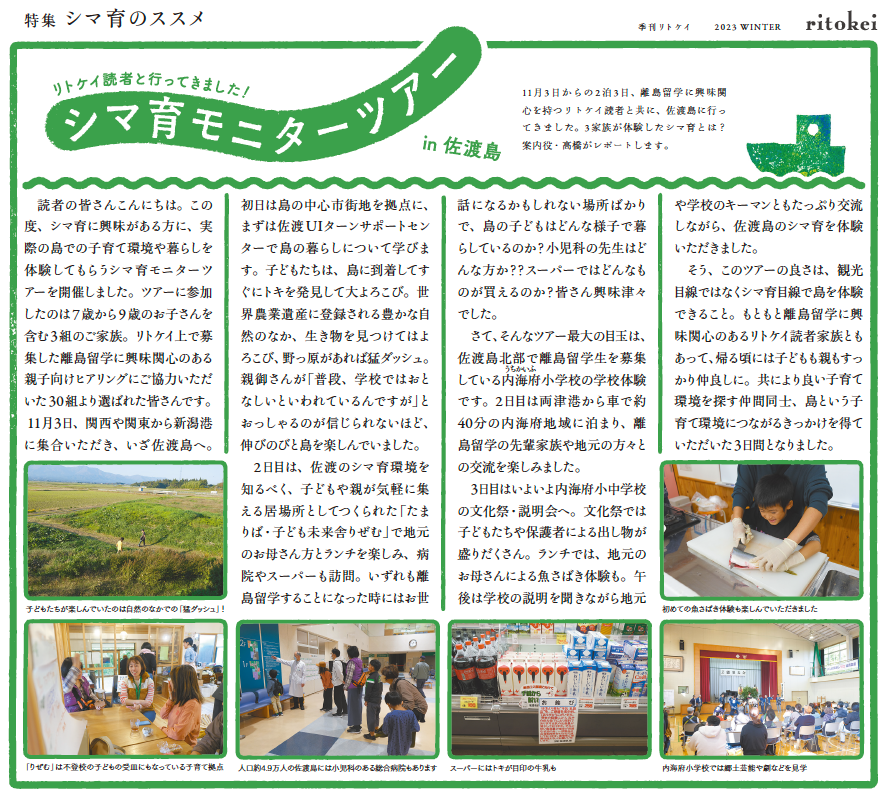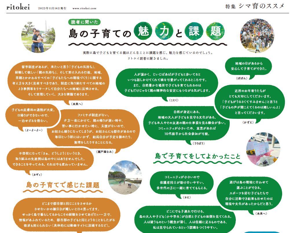 NPOリトケイが運営する有人離島専門メディア『ritokei』の姉妹メディアとして2023年秋に誕生した島と親子をつなぐ『シマ育コミュニティ』。