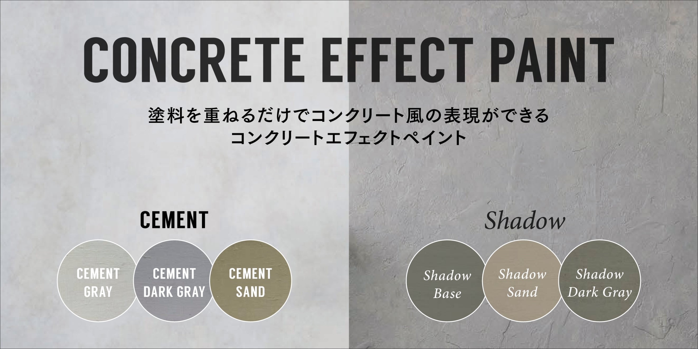 コンクリートエフェクトペイントの色見本板は、「セメント」「シャドウ」の2種類のカラーをご用意しております。