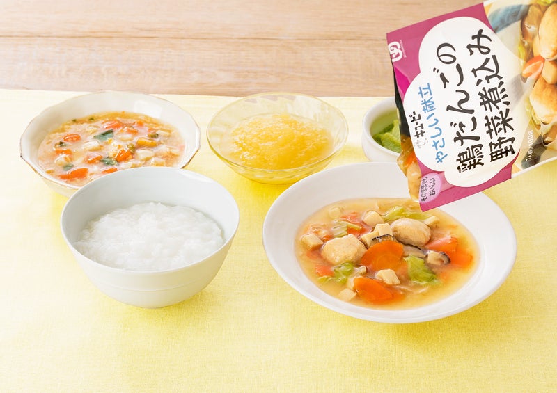 1998年に日本初の市販用介護食として誕生。日常の食事から介護食まで幅広くお使いいただけるユニバーサルデザインフードの基準に準拠した食品です。かむ力や飲み込む力に応じた4区分(容易にかめる・歯ぐきでつぶせる・舌でつぶせる・かまなくてよい)と「とろみ調整」で構成され、全52品をラインアップ。(2022年6月時点)