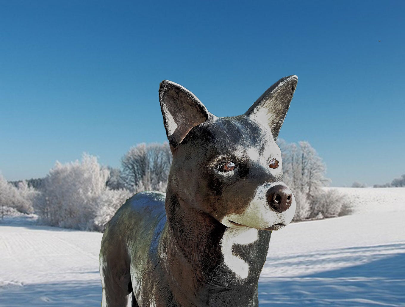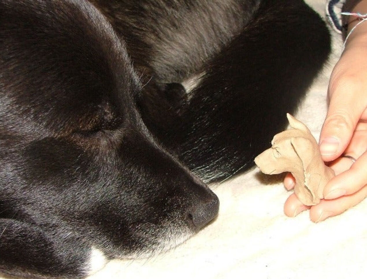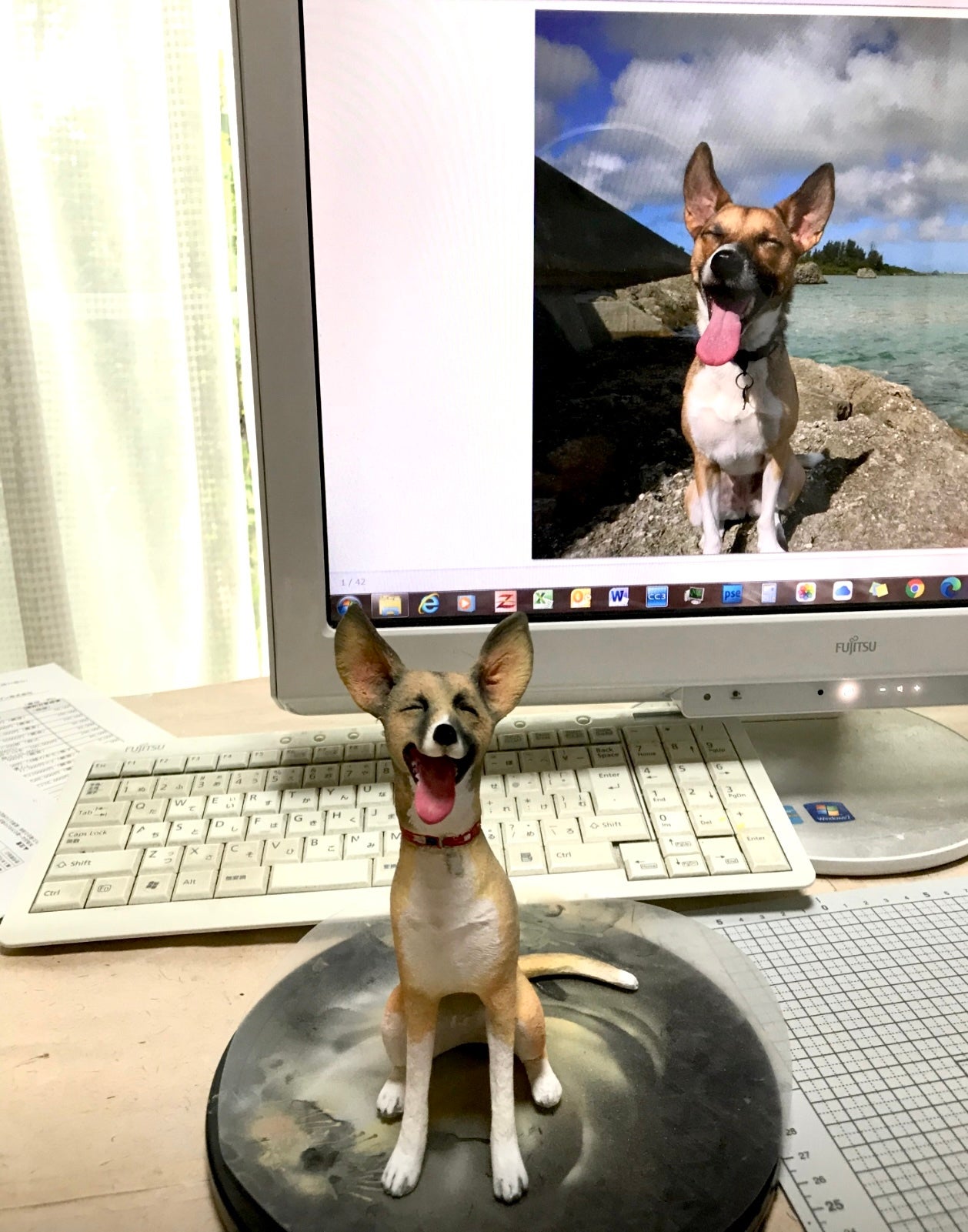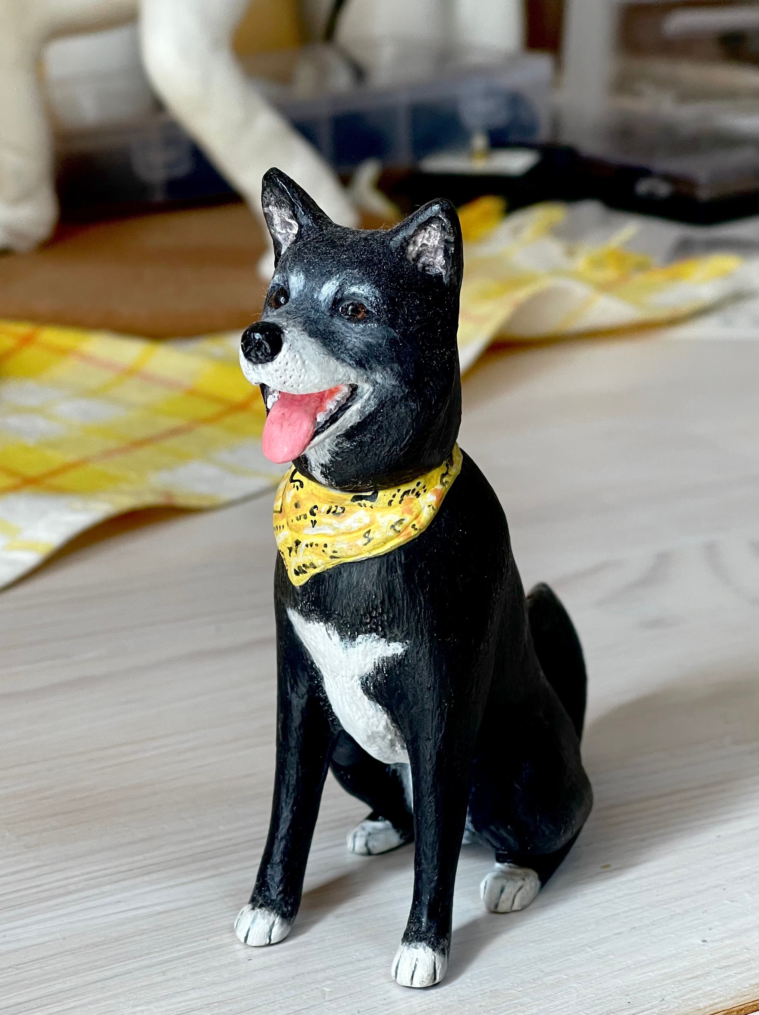 素材は石塑粘土、芯材に難燃性のスタイルフォーム、アクリル絵具にて着色し、防水ニスで仕上げます。毛並みの忠実な再現は厳しいですが、大切な愛犬愛猫のアイノカタチとなります。