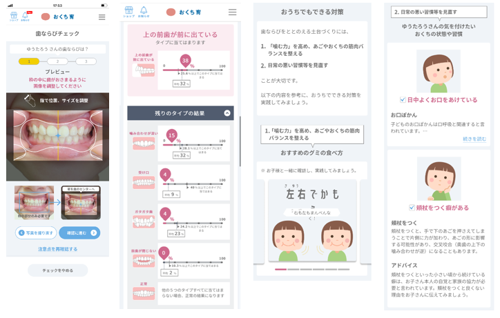 「イー」の口の写真と、簡単な生活習慣のアンケート結果から、『おくち育会員サイト』のAIが歯ならびタイプをチェック。1ヵ月に一度、定期的にチェックすることで、歯ならびの写真を管理することが可能です。