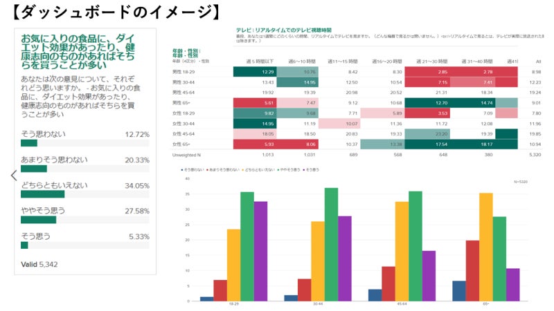 「YouGov Profiles」は、生活・行動全般に関する約9,000人の1,100超の質問項目への回答データにアクセスが可能で、プラットフォーム上で属性別の集計やグループ比較、ビジュアル化等も簡単に行うことができます。このツールによって、ターゲットとなる消費者を特定、理解し、いつ・どこでリーチすべきか等の分析を、精緻かつスピーディーにできるようになります。