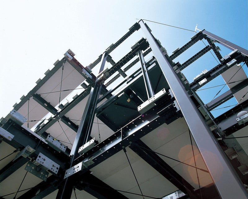 ビューノが採用する重量鉄骨ラーメン構造は、全国の中高層ビルにも採用されており、過去幾多の地震の中でその安全性を実証してきました。一般的な重量鉄骨構造では鉄骨同士の結合部に溶接を用いますが、溶接の精度は施工者の熟練度に頼るところが大きく、均一な精度の保持が困難です。ビューノでは独自のボルト構法を採用してシステム化。これにより施工者の熟練度に頼らずとも高精度で強い架構体を開発。在来工法に比べて現場もクリーンで、工期も大幅に短縮可能です。ビューノでは異なるサイズの柱と梁を組み合わせることによって、必要な空間の大きさや高さに対応。3階建から9階建まで建築可能です。都市部に多い狭小地においては、建物を高度利用するために、施工性も重要な要素です。無足場工法は、狭小地向けに足場なしで施工するもので、隣家との境界線ギリギリ(*)まで建物を寄せた建築が可能です。