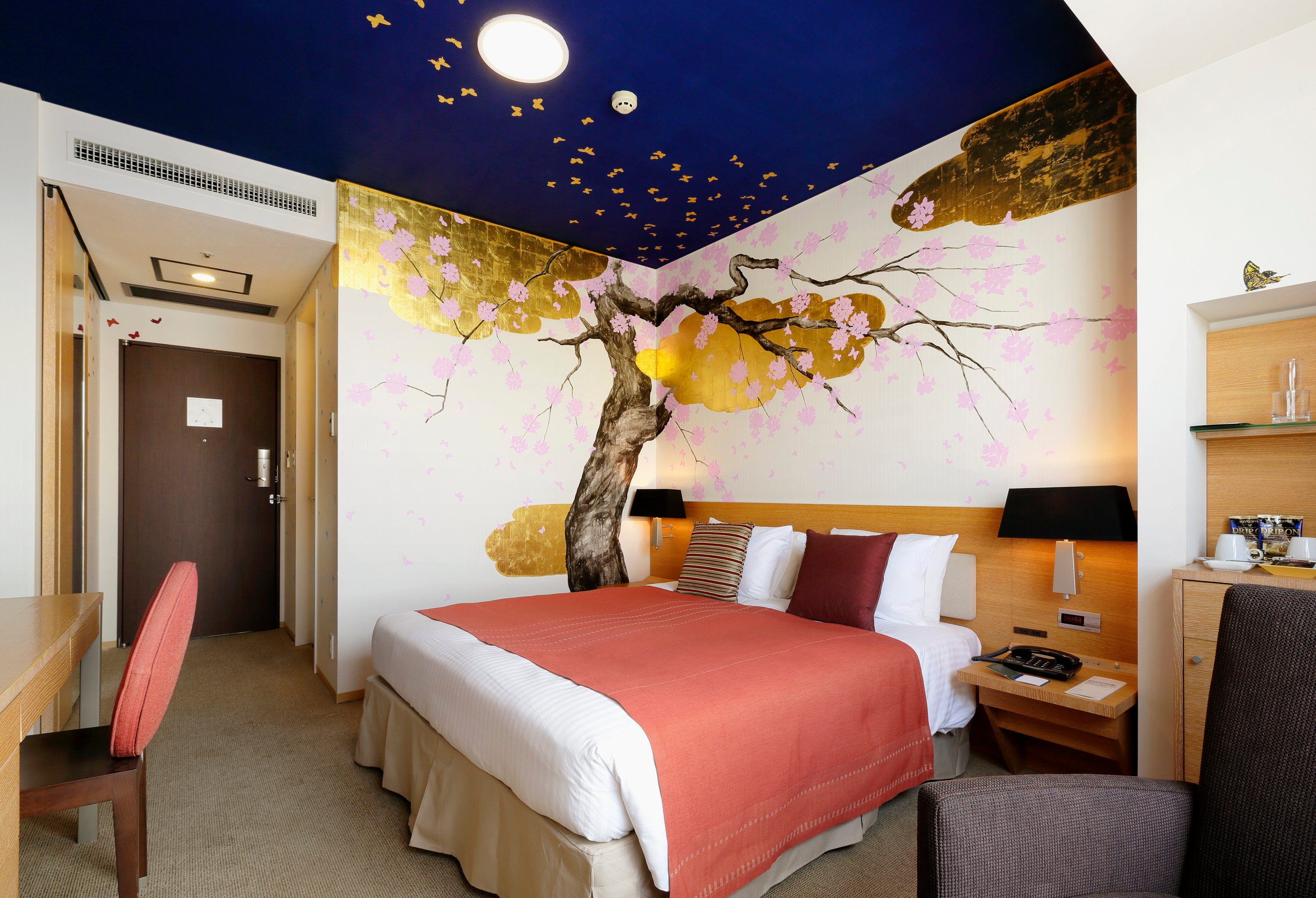 「もともと日本人は、襖や屏風などを用いて日常生活にアートを取り入れてきた」という大竹さん。客室の角を屏風の折り目のように見立て、桜の木を描くという空間コーディネートをいたしました。部屋に入るとまず目に入るのは、ベッドを覆うような大きな桜。桜の花を儚さや魂の象徴である蝶で描くことで、散り際の美しさを表現いたしました。蝶は部屋を周遊しながら、春夏秋冬という四季の巡り、また循環を表します。また桜の木の向こうに描かれている華やかな金色の雲は、およそ400枚の金箔を、一枚一枚丁寧に貼って仕上げました。 ベッドに横たわると、桜の木からは花びらの形をした蝶が舞い散る。一方、窓の外には東京タワーを借景に都会の風景が広がる。このコントラストに、諸行無常の理を感じていただけるでしょうか。 桜の散り際に込められた、日本人の美意識をアーティストルーム「桜」で、どうぞご覧ください。