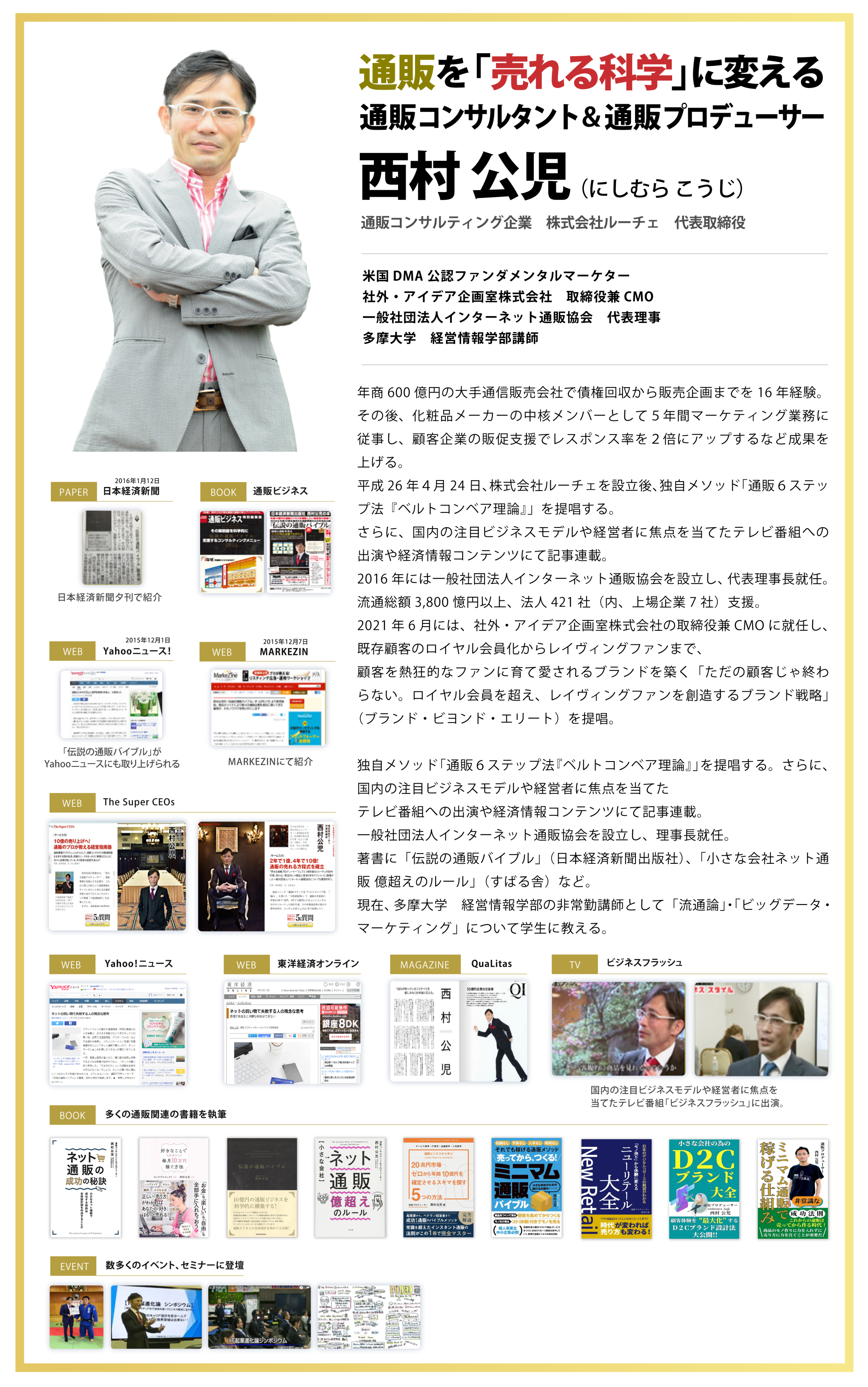 平成26年4月24日、株式会社ルーチェを設立後、独自メソッド「通販6ステップ法『ベルトコンベア理論』」を提唱する。