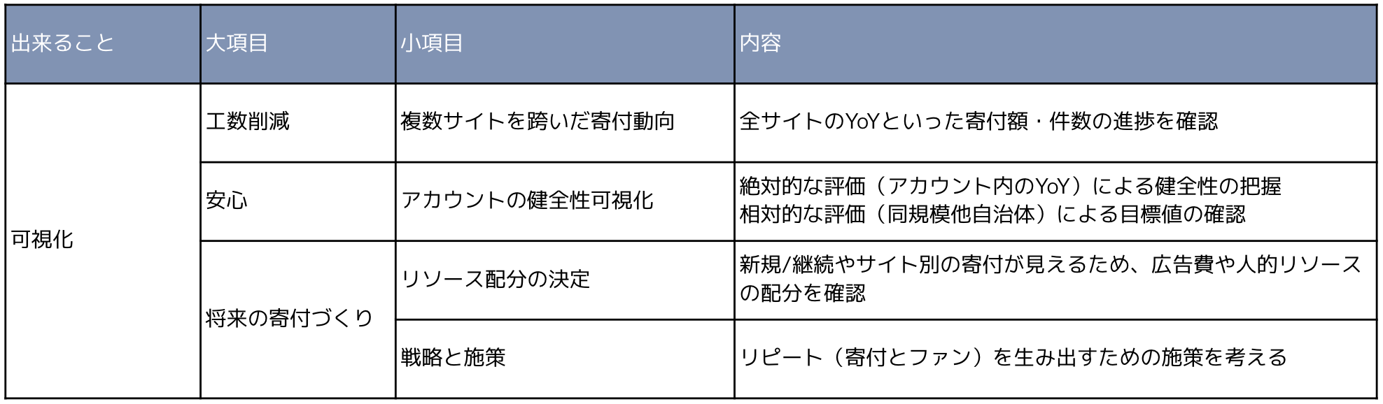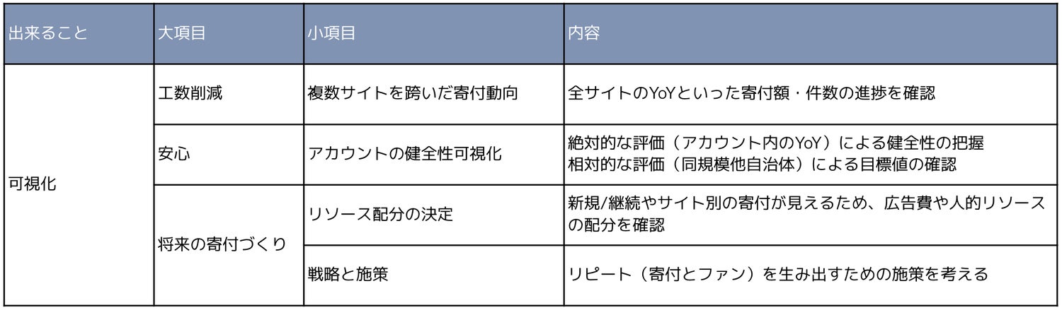 その年、その自治体に「ふるさと納税」で寄付をした人のうち、新規とリピーターの割合は?寄付額の構成比の内訳は?などを見える化し分析することができるシステムです。
