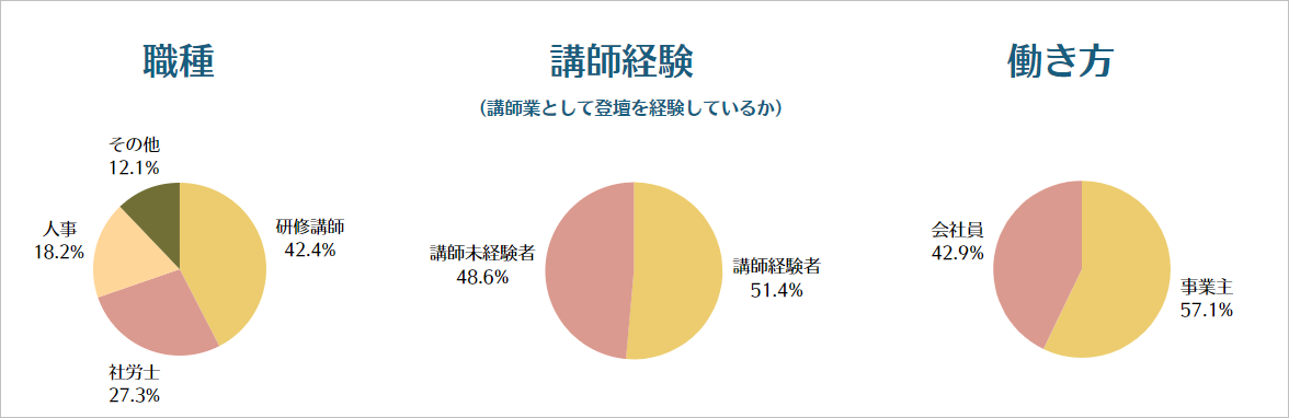 対象者は士業の方、コンプライアンスや人事の方などが多いですが、講師未経験の方もご受講いただけます。