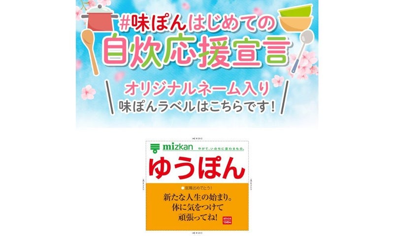 「#味ぽんはじめての自炊応援宣言」をつけて投稿すると、抽選でオイシックスギフト券が100名様に当たります。また、自分や家族・友人に向けて、名前を入れたオリジナルラベルが作れる企画も行います。新生活をスタートされる大切な方を応援するメッセージもご用意しています。