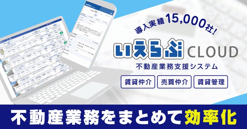 「いえらぶCLOUD」は賃貸・売買・管理すべてに対応したオールインワンの不動産業務支援SaaSです。リアルタイムのポータル連動、LINEやチャットなどの自動追客機能、インボイス制度への対応など顧客ニーズに応えた機能を備えています。毎週という高頻度で行われるシステムアップデートや、幅広い業務を一気通貫でオンライン化できる使いやすさが支持されており、全国の不動産会社15,000社以上で導入されています。