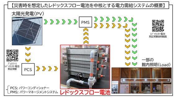 太陽光での発電後、レドックスフロー電池へ蓄電し、照明点灯までのフローをリアルタイムで管理。さらに、家庭用蓄電池への実用にも拡張できる研究プロジェクトも進行中。再生可能エネルギーのさらなる普及を見据え、レドックスフロー電池の研究開発を産学官連携で推進し、社会実装を目指す。