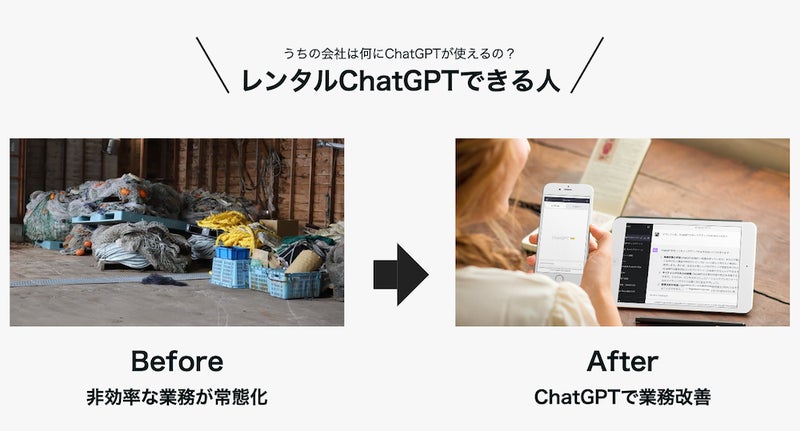 そんな会社向けのコンサルティングサービスが「レンタルChatGPTできる人」です。