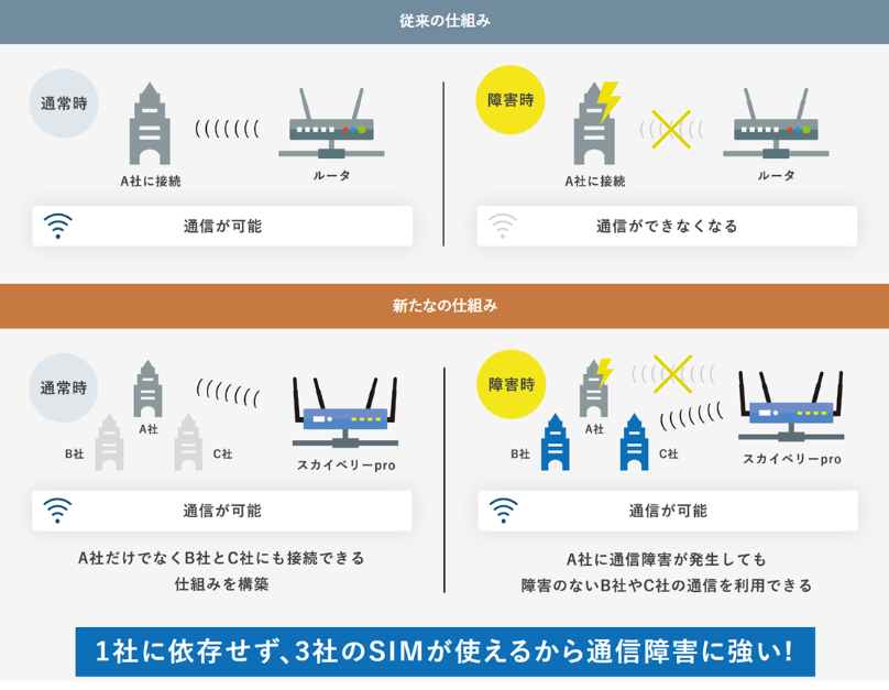 スカイベリーpro®の特徴はドコモ、au、ソフトバンクの大手携帯事業者のSIMを1台の機器に差し込めることです。また、通信の状況を監視し、使用するキャリアを自動的に切り替える機能を持っており意識することなく、障害のない回線を継続して利用することができます。