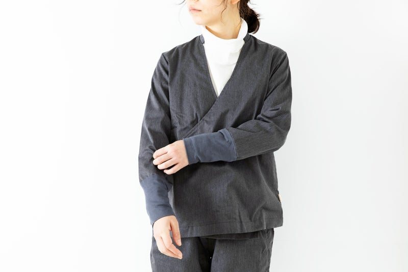 一方、SAGYOの作務衣は立衿が象徴するワークフォーマルを追求しました。