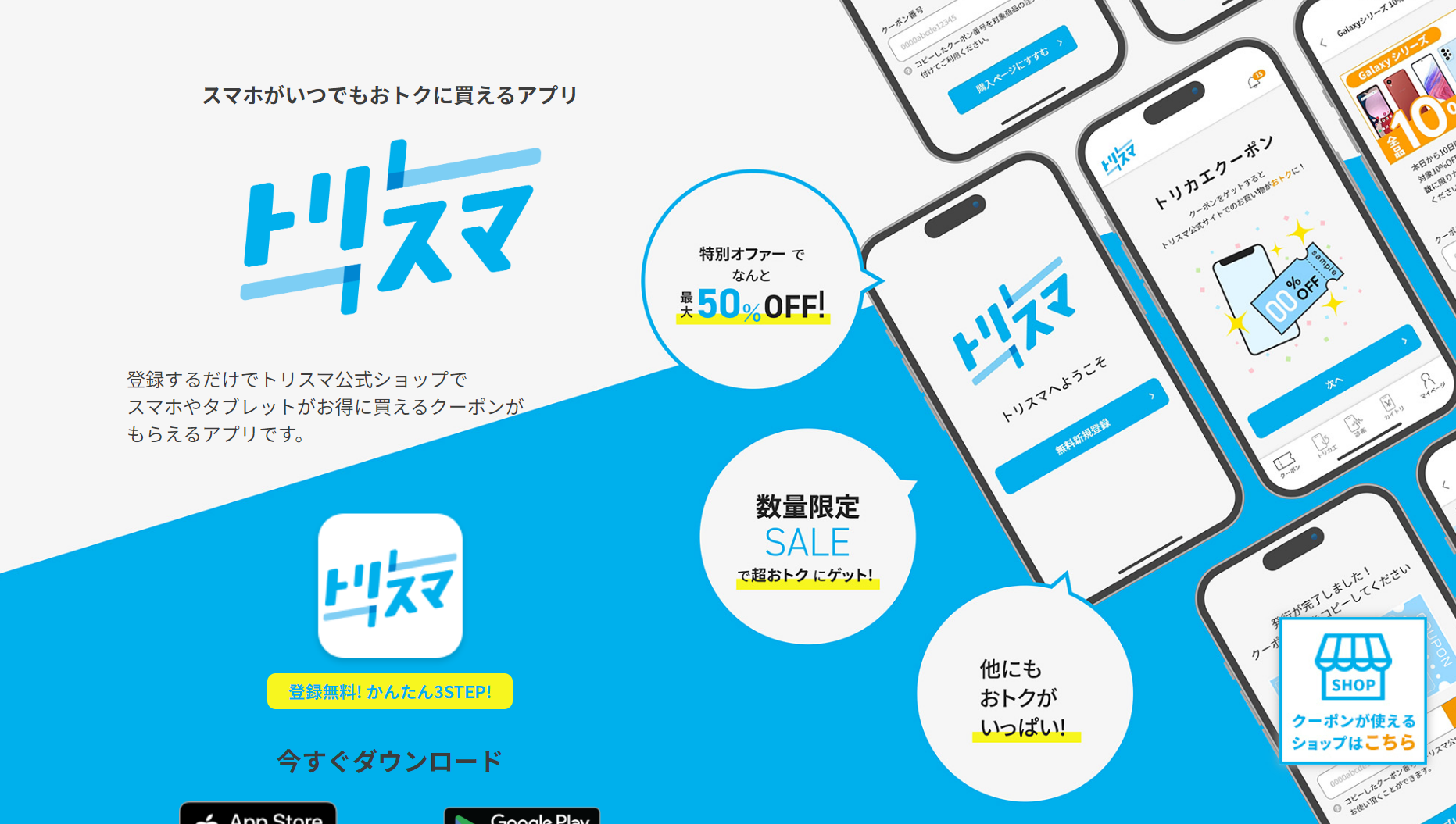 登録するだけでトリスマ公式ショップでスマホやタブレットがお得に買えるクーポンがもらえるアプリです。数量限定のスマホ、タブレットや特別に50%オフ等のクーポンが届くアプリです。