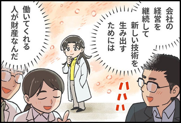 勉強熱心でがんばり屋、研究開発や会社経営の苦難にも昼夜問わず向き合い、乗り越えてきたことで、本人も成長。