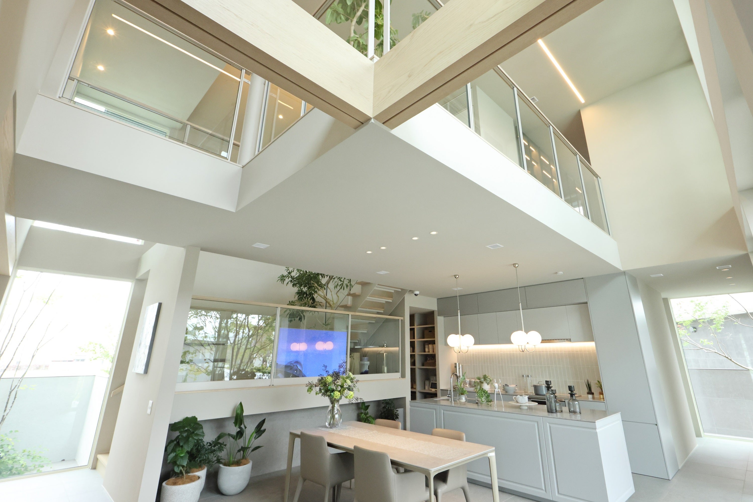 2023年4月に新発売した戸建住宅NEW『カサートプレミアム』では、複数の吹き抜けによる「光の回廊」を提案。広大な吹き抜けにおいても、全館空調の『エアロハス』により、四季を通じて快適に過ごすことができます。