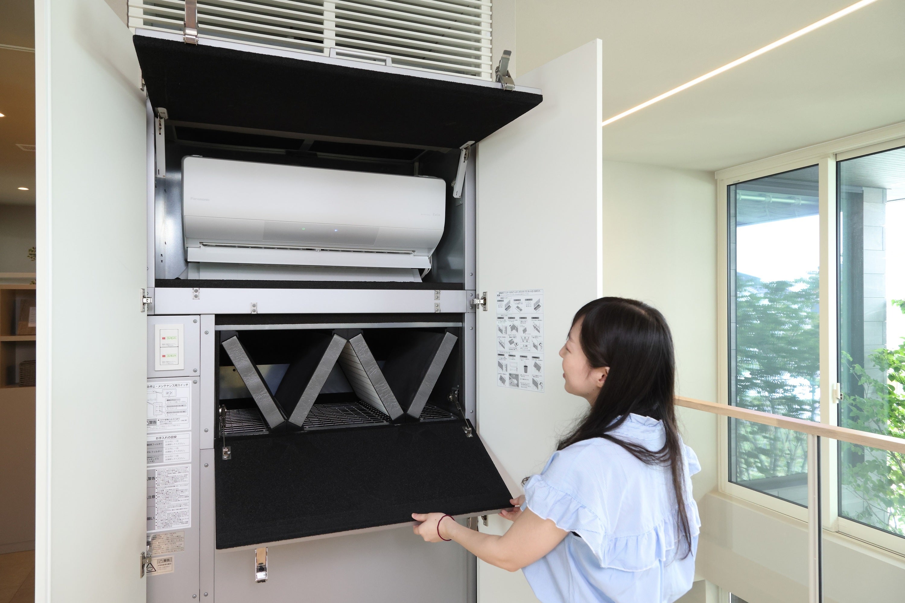 『リフォーム用全館空調』は、当社の既存住宅にお住まいのオーナー様(※)に、快適・省エネな空気環境を提案。各階に室内機を設置することで、全階はもちろんワンフロアだけの空調も可能なほか、床下の地熱活用や除塵性能が高い「HEPAフィルター」(左写真)を採用した換気システムにより、きれいな空気を均一な温度で室内に巡らせ、建物内外の温度差を感知して自動で省エネ運転。居室や共用部の温度差を解消し、冬場に発生しやすいヒートショックのリスクを低減します。さらに、室内全体を均一な温度で空調できることで、扉や間仕切りが少ない大空間も実現しやすくなり、家族構成や暮らしに合わせたリフォームも可能となります。