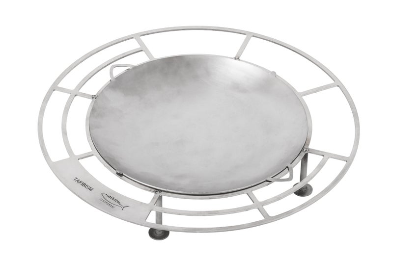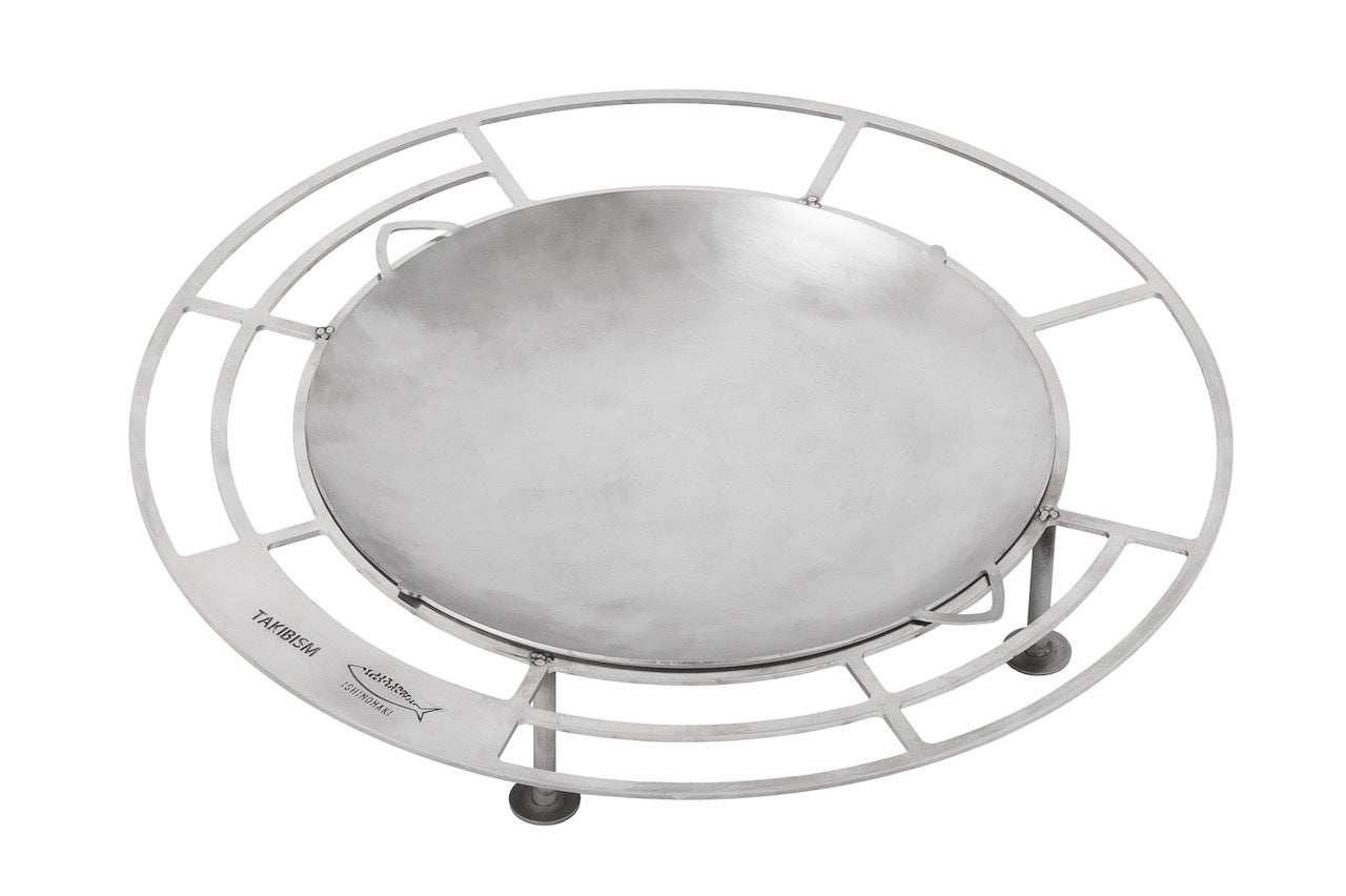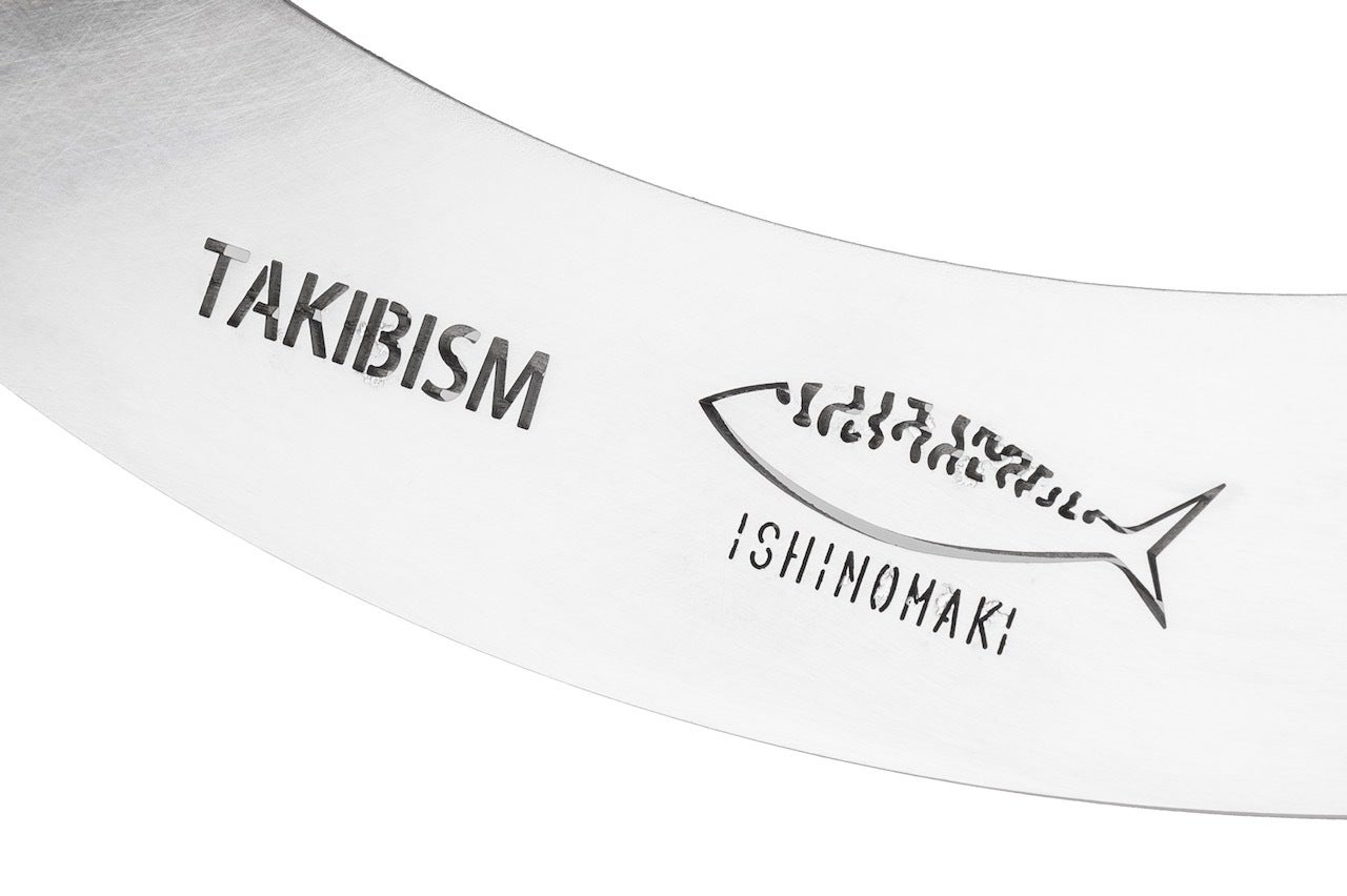 限りなく直火に近い超低床型の焚き火台として、人気を博してきたタキビズムの定番モデル「JIKABI」を、ISHINOMAKIモデルとしてブラッシュアップ。本体、脚、炉皿は、分解してコンパクトに収納・持ち運べる特徴はそのままに、ステンレス製の本体フレームを増やすことで、強度を高めつつ、鍋や石などがより置きやすい汎用性を加えました。火床となる炉皿は、プレス加工ではなく、1つ1つ手打ちで成形。質感に深みを持たせています。刻印されているロゴは、石巻市の特産である金華サバがモチーフになっています。