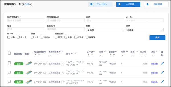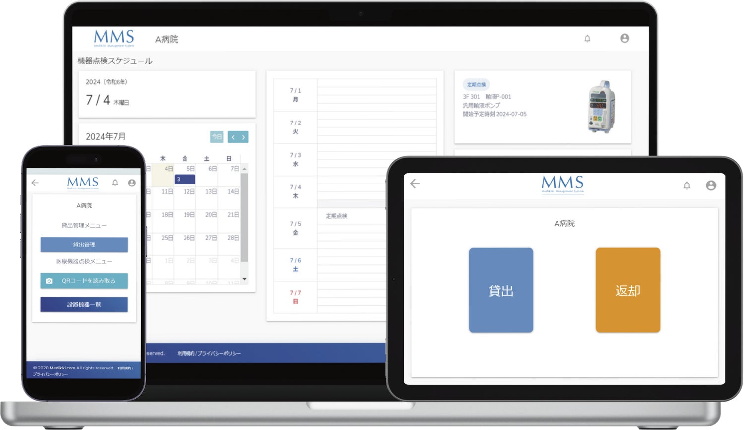 「MMS」は臨床工学技士の主な業務である医療機器管理を、効率的に実現することができるクラウド型医療機器管理システムです。